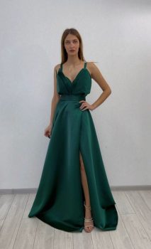 Rochie lunga verde din tafta cu design deosebit la bust si slit pe picior