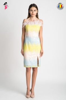 Rochie Xara de seara cu paiete colorate si pene aplicate in jurul decolteului bretele din tulle fin transparent lungime midi material elastic si croi conic. Deosebit de pretioasa si eleganta aceasta piese vestimentara te va face sa te simti admirata si apreciata. Intretinere:Respectati instructiunile de curatare de pe eticheta produsului.Info model:inaltime 170 cm poarta marimea S.Produs fabricat in Romania.
