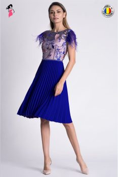 Rochie Xara eleganta de seara cu pene la umar si fusta solata