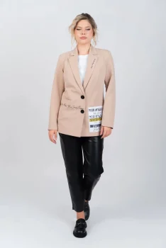 Sacoul casual bej este conceput dintr-o stofa subtire si este extrem de versatil fiind usor de integrat atât într-o tinuta casual cât si într-una formala.Are o forma dreapta rever si doua buzunare laterale cu refilet.Se închide cu doi nasturi negri.Inscriptiile de pe partea din fata transforma sacoul într-unul cu adevarat special.Îl poti integra în tinute diferite cu blugi pantaloni de piele fusta sau o rochie.IntretinereRespectati instructiunile de curatare de pe eticheta produsuluiInfo model: inaltime 170cm poarta marime SProdus romanesc.