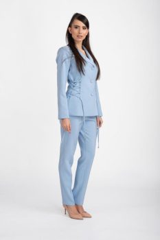 Sacou LaDonna office bleu cu croiala cambrata si lungime medie. Prezinta rever ascutit se inchide cu un rand de nasturi si prezinta snur reglabil la talie. Ideal de purtat in tinute office sau casual. Dublura fina pe interior.Produs romanescIntretinereRespectati instructiunile de curatare de pe eticheta produsului.Info model: poarta marimea S inaltime 170 cm