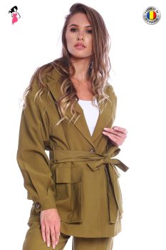 Sacou dama casual de culoare kaky cu croiala cambrata si lungime medie accesorizat cu un cordon detasabil croiala lejera. Are reverul ascutit inchidere cu un rand de nasturi buzunare laterale si este ideal de purtat in tinute de zi office sau casual.Produs romanescIntretinereRespectati instructiunile de curatare de pe eticheta produsului.Info model: poarta marimea S inaltime 170 cm.