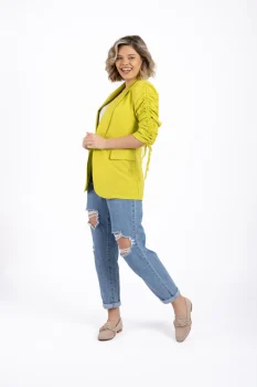 Sacou dama din vascoza cu croiala lejera si guler sal. Este prevazut cu un canal cu snur care ajuta la scurtarea manecii dupa dorinta clientei.Intretinere:Respectati instructiunile de curatare de pe eticheta produsului.Produs romanesc.Info model:inaltime 170 cm poarta marimea SCompozitie : 90% poliester 10% Vascoza